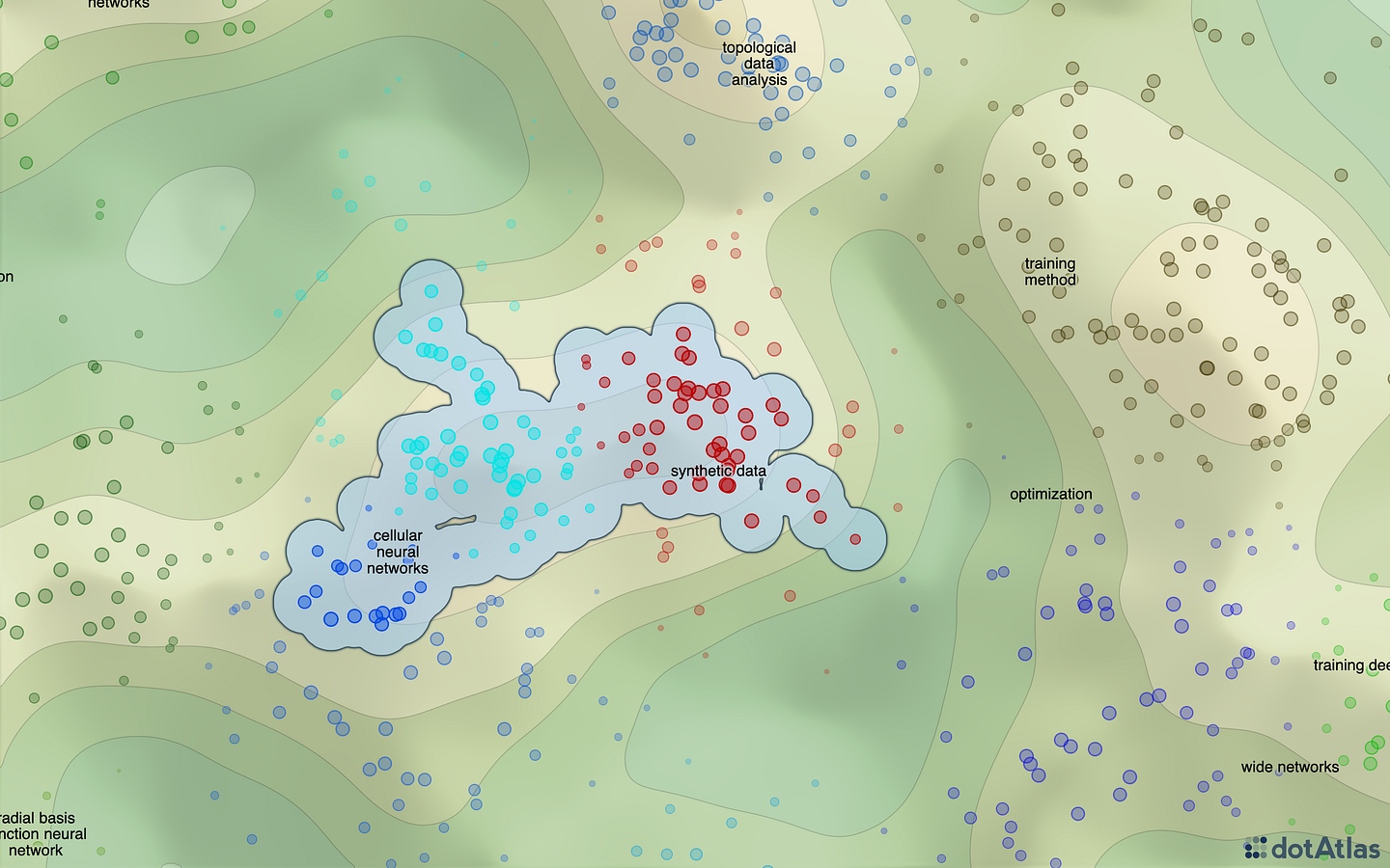 dotAtlas is a great tool to visualize and explore collections of 2D points. This screenshot shows a zoomed-in dotAtlas visualization of over one million arXiv paper abstracts.